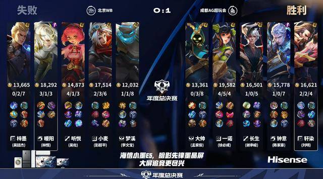 第二局钟意拿出野核暃,在小麦清完上路线之后,钟意预判了小麦的撤退路线,从自家野区一路追到了WB的二塔,平A接一技能大招直接单杀小麦。这局AG基本上是一路平推,WB完全没有还手之力,上高地时已经领先了8千。狂铁闪拍打退小麦,钟意一个大招斩掉暖阳和梦溪,AG再下一城,钟意连续两局都拿到了MVP。