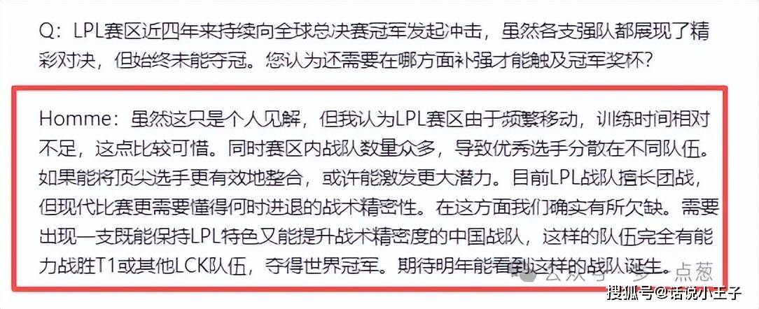 红米教练就在采访中指出,自己认为LPL赛区频繁移动,训练时间相对不足,这点很可惜。同时赛区内队伍数量众多,导致优秀的选手分散在不同的队伍,如果能够将这些顶尖选手更有效的整合,或许能够激发出更大的潜力。现在LPL的队伍擅长团战,但是现在比赛更需要懂得如何进退的战术机密性。这方面LPL有所欠缺,需要出现一支既能保持LPL特色又能提升队伍精密性的队伍,那么这样的队伍将有能力战胜T1,和LCK其他队伍夺得世界赛冠军,期待明年可以诞生出这样的队伍。