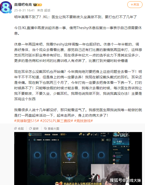 而在这场失望的背后,TES的核心选手JKL再次成为舆论焦点,随着数据显示他与TES的合同将在11月到期,外界对他去留的讨论愈演愈烈,尤其是他此前多次提到“想在今年打完后休息”的言论,更是让粉丝情绪爆发——“既然说了要休息,那就请你兑现诺言吧!”