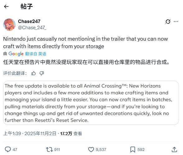 玩家对这一变化反应热烈,部分用户在社交媒体上表示:“这是我一直最想要的功能,他们竟然没在预告片里提?”另一位玩家评论:“天哪,总算来了。”这一更新被认为将显著改善游戏体验,尤其是在岛屿建设和日常管理方面。