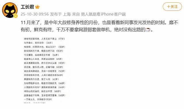 工长君说:“11月来了,是中年大叔修身养性的月份,也是看着新同事发光发热的时刻。靡不有初,鲜克有终,千万不要拿网游那套做单机,绝对没有出路的。”