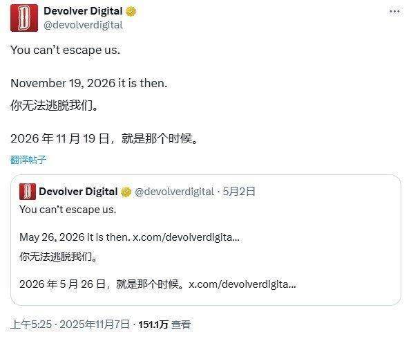 Devolver Digital今日在官方社交媒体上发布了最新通告,内容依旧简短且充满挑衅:“你无法逃脱我们。那么,就定在2026年11月19日了。”这已是该公司第三次做出此类宣示。