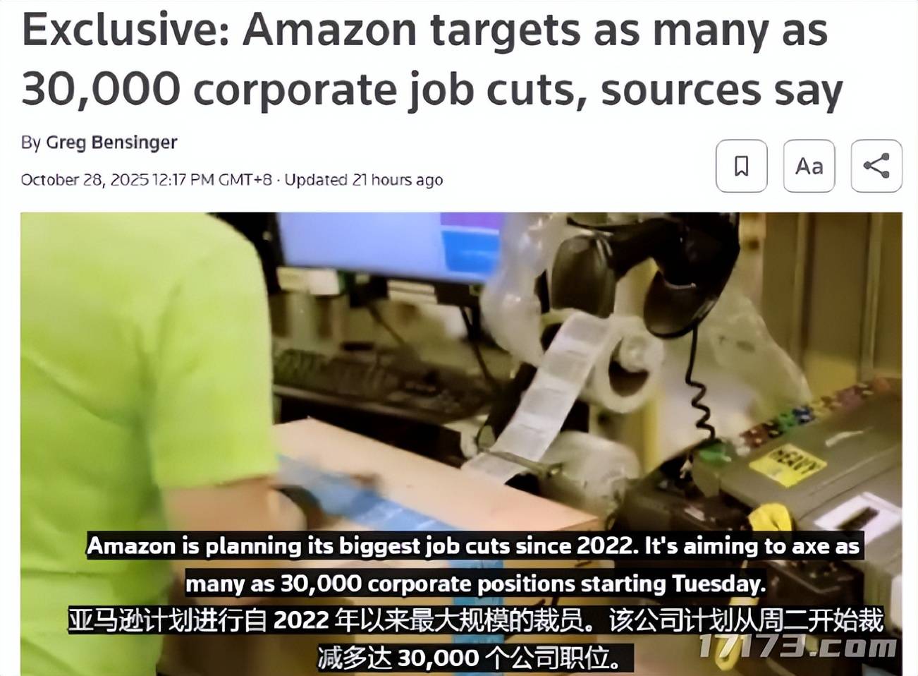 10月底,路透社传出消息称,亚马逊正计划启动新一轮大规模裁员,涉及人数高达3万人,将成为自2022年底裁员约2.7万人以来,其历史上最大规模的一次人员收缩。