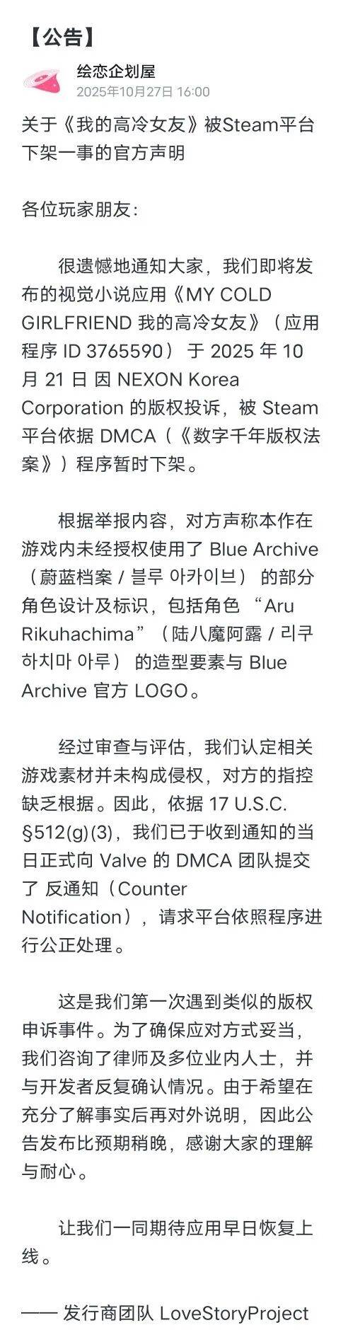10月27日,一款名为《我的高冷女友》的游戏,被Steam平台肘击下架了。据游戏官方解释,下架原因是版权问题,但官方并不认为自己有在侵权。
