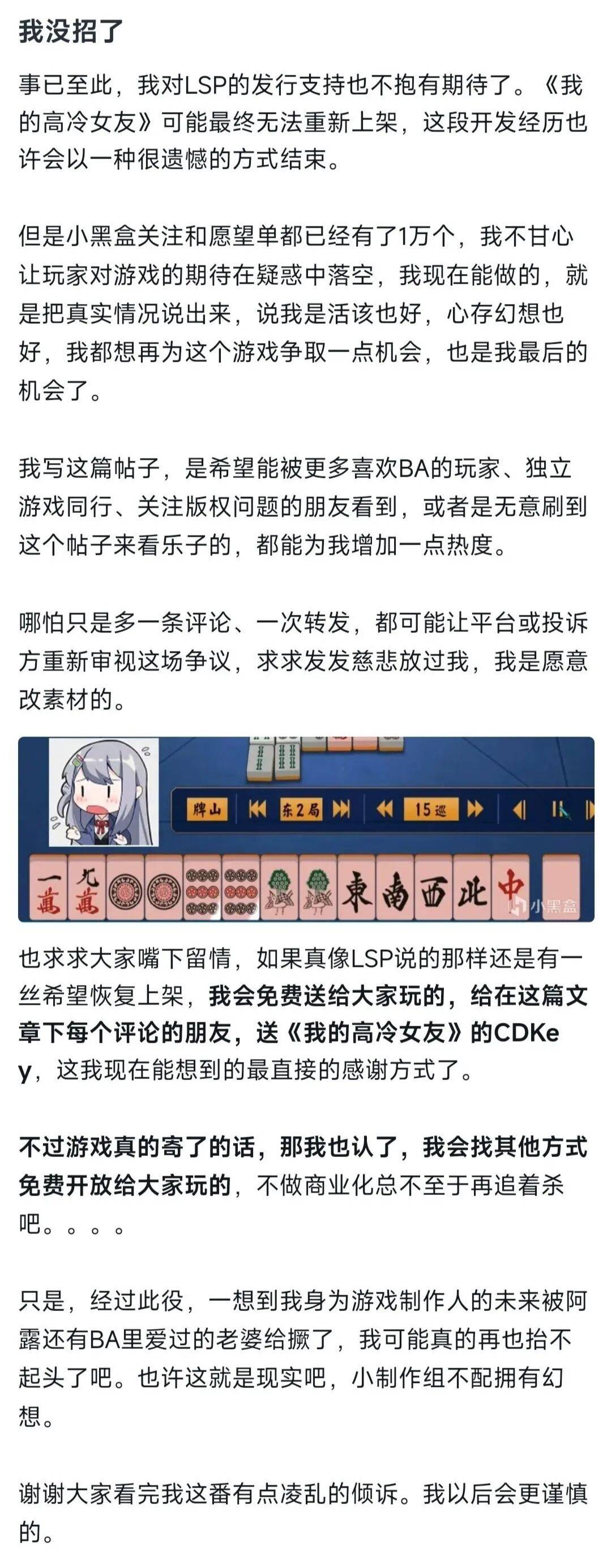 除了官方公告之外,游戏制作人也有在小黑盒发布长文。