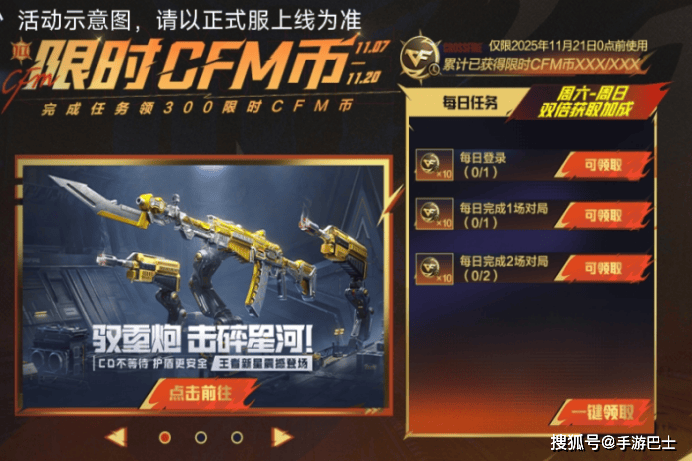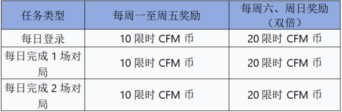 活动期间,每日完成基础任务就能稳定获取限时CFM币,更有周末双倍福利加持,轻松攒币无压力!具体任务及奖励如下: