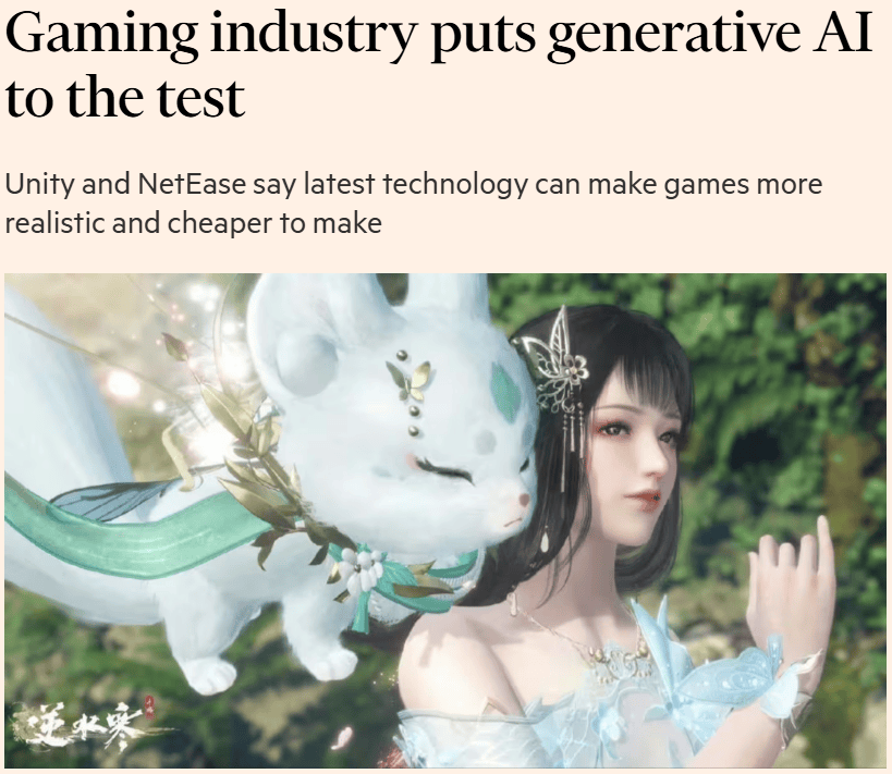 《金融时报》 (Financial Times)在2023年6月就发过一篇文章,聊《逆水寒》手游将生成式AI做进了游戏。该文章还被纽约大学坦登工程学院官网转发,学院副教授Julian Togelius就此事评价说:“我们将会看到新型的、围绕AI游玩体验而设计出的游戏。”