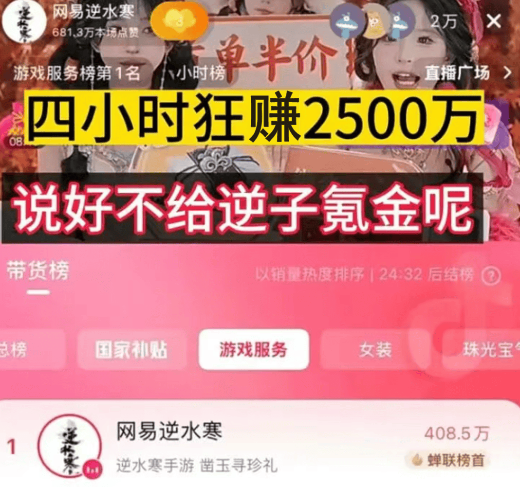 最明显的例子就是今年9月,逆水寒手游官方在抖音开启了首场带货直播,在短短的四小时之内就狂圈2500万元,10.8元的凿子一小时卖出33万个,9块9的凿玉盒子也卖出7.3万个,诸多相关周边产品上架之后更是被一扫而空,最终创下3000多万元的收入,直接晋升“抖音带货王”。