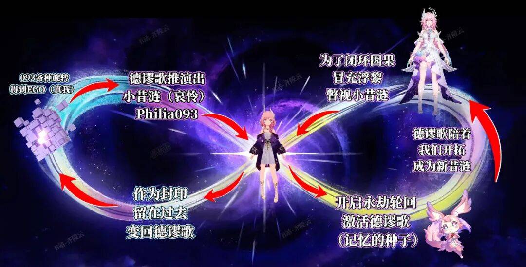 至此,一切伏笔回收:耗尽力量的昔涟(Philia093)在轮回之始开启了“永劫回归”,阻止再创世;