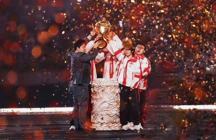第六局,中期的团战是一个关键节点,狼队辅助李自威(ID:一笙)操作的东皇太一闪现开团,但没能秒掉对方,被AG打出2换4,顺势推掉高地,并在之后一路运营,最终靠着下路龙兵平推,以4比2的比分结束了整场比赛。在全场爆发的欢呼声、金色的彩带飘雨中,成都AG超玩会成功蝉联年度总冠军。