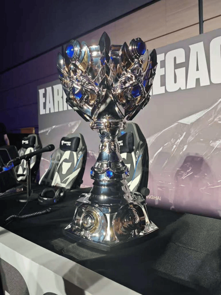 在T1的赛后媒体采访即将开始时,工作人员搬来了召唤师奖杯,放在了采访席上,引得在场的媒体纷纷上前围观拍照,我也不例外。这是我第一次以媒体的身份在现场看S赛,如无意外,这也会是我人生中离这座奖杯最近的一次——比BDD,比KT,比所有人都要近。