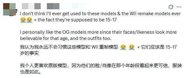 然而,也有大量系列老玩家表达了不适应。许多评论指出,尽管角色设定年龄在15-17岁之间,但新模型的面部表现与Wii重制版一样,都让他们感到难以习惯。有玩家明确表示更偏爱原版模型,认为原版人物的面容和样貌更符合角色的青少年年龄设定,看起来更为真实可信,早期的服装设计也更具味道。