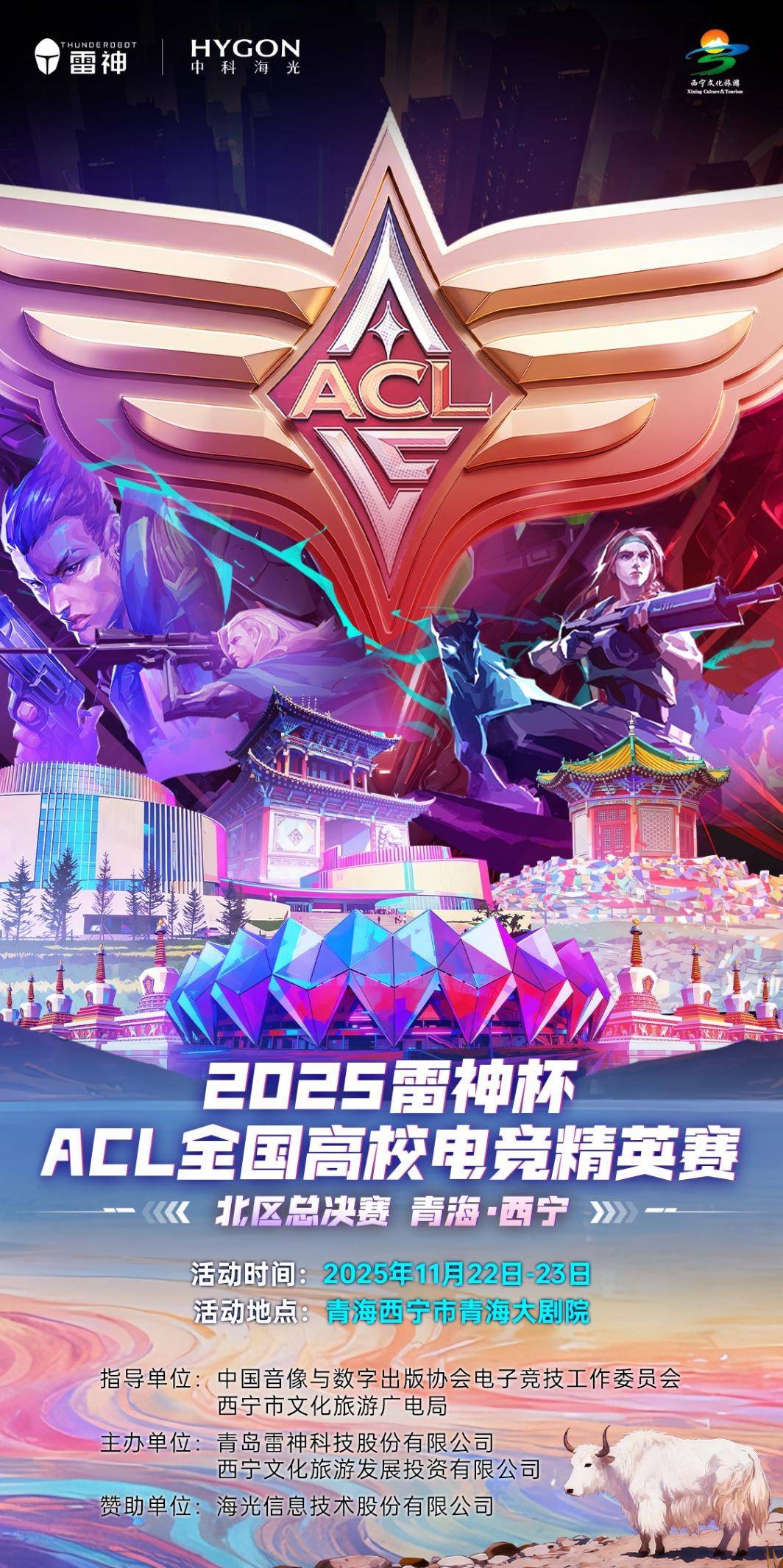作为由雷神科技打造的专注于高校群体的专业电竞赛事品牌,本届ACL赛事自启动以来便备受瞩目。赛事覆盖超200所高校,吸引逾1600支战队报名参加,参赛人数突破1万人次。ACL赛事不仅搭建了年轻选手梦想的舞台,更持续推动电竞与科技、文旅的深度融合。经西宁市文化旅游广电局、西宁文化旅游投资发展有限公司、雷神科技携手推进,本届北区决赛落地“中国夏都”西宁,是电竞文化与高原特色的一次激情碰撞。