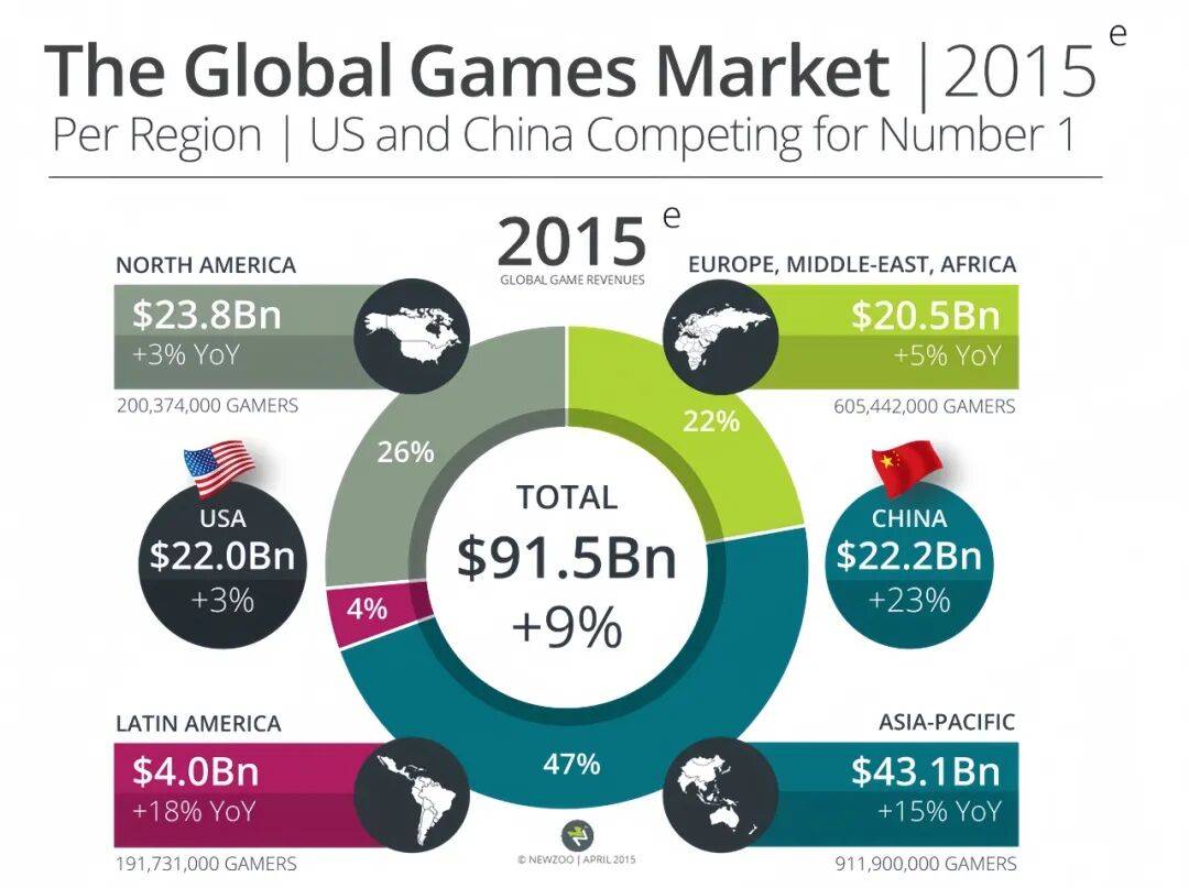 根据Newzoo发布的《2015年全球游戏市场初步报告》显示,2015年全球游戏市场规模将达到915亿美元,亚太地区以15%的同比增幅为全球最高,预计市场规模达431亿美元,接近北美洲、欧洲、中东地区以及非洲之和。而中国市场又是亚太地区里最高的,同比增长23%。