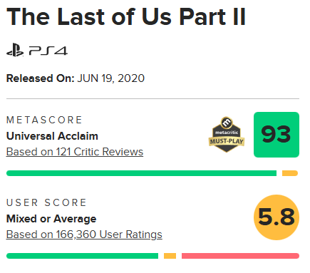 首先,最显性的变化就是随着传播媒介的变化,媒体权威的崩塌,叙事中心回归到了玩家用户社区。这进而导致由媒体评审主导的TGA奖项,与玩家需求的冲突进一步升级。媒体普遍高分,但玩家不买账的案例越来越多,到了《最后生还者2》身上算是来到了一个高潮。