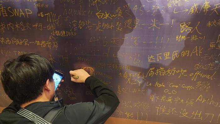 我顺着SKxingZ指的方向到签名墙寻找,花了好一阵子才看到他的手绘。玩家们的签名令我眼花缭乱,好玩有梗的实在太多了,期间还不断地有人赶过来,有的甚至掏出手机原地开画,向我直观展示了什么是“厨力惊人”。