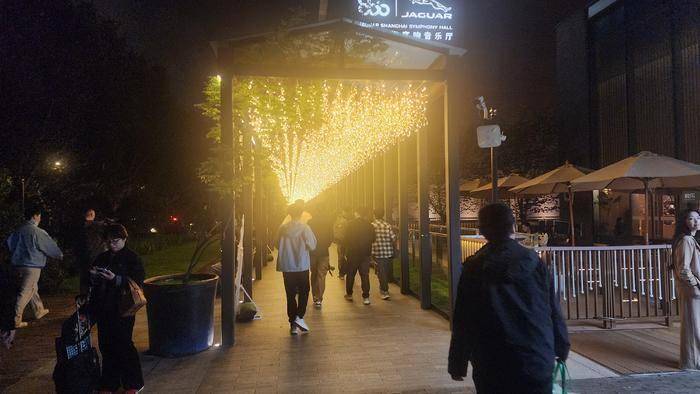 湿润的空气中隐隐飘着桂花的香气,音乐厅建筑外缘的玻璃长廊此时亮起了星星灯,照耀着游戏角色,也照耀着行走其中的玩家们。不知怎的,我想起音乐会里《今晚月光明亮》那首曲子。哼着记忆里的一段调子,我决定和人群一起再逗留会儿,不着急回去。