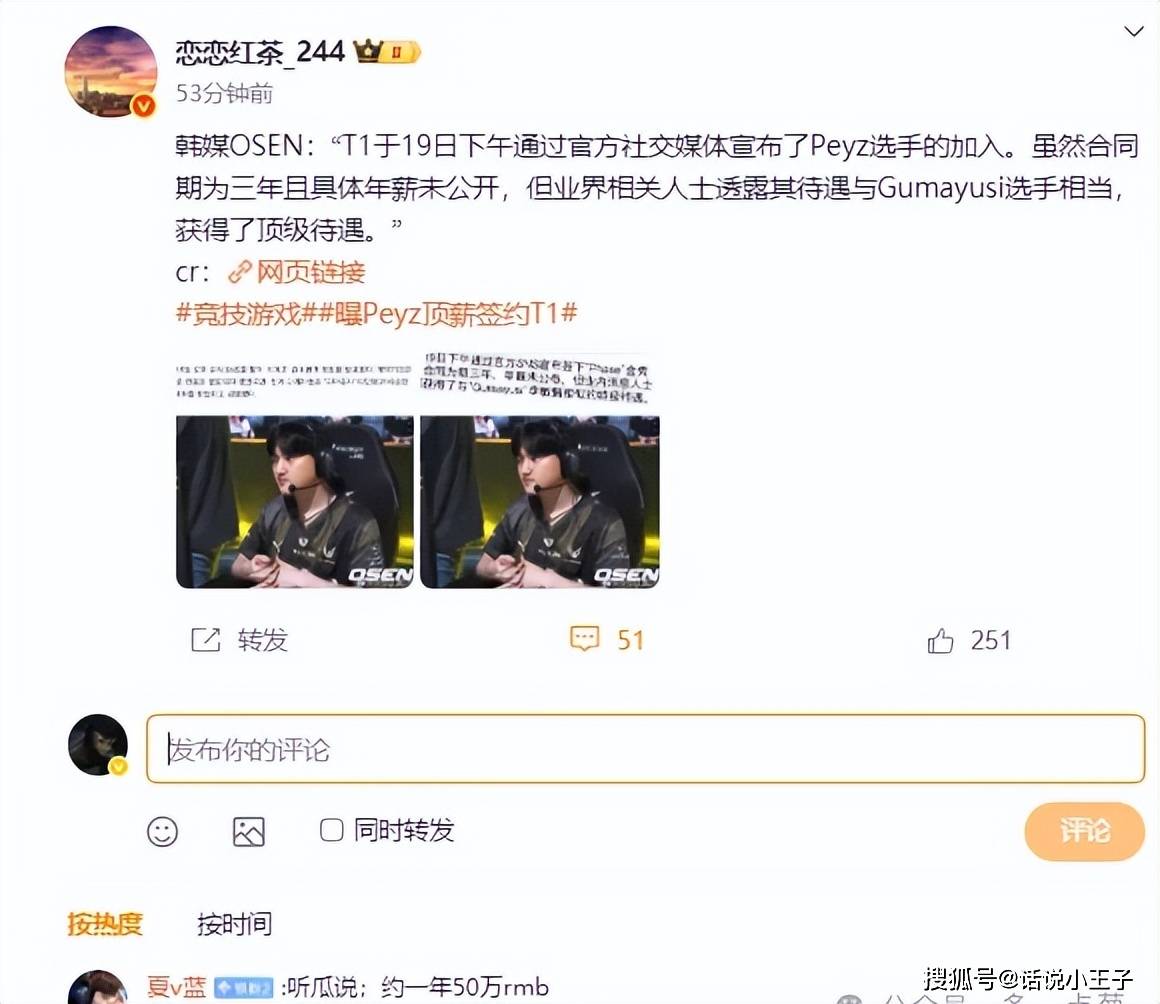 最终的结果大家也都看到了,那就是T1已经官宣了Peyz加入,一签还是三年。T1选择Peyz也是有原因的,那就是Peyz很便宜,究竟便宜到什么地步呢?那就是一年只有50RMB。小吕布和T1谈的薪资差不多是在1,000万RMB左右,这中间直接差了20倍。Peyz本身还是很有实力的,他是LCK最年轻的冠军AD,加上FMVP。在这种情况下,Peyz的性价比远超任何一名AD选手。对于Peyz本身来说,他家里是比较有钱的,现在一心想回到LCK,而且是想找一个能出成绩的队伍,T1自然就是最好的选择。一方面他不会觉得自己薪资低,而且他能够接受轮换。