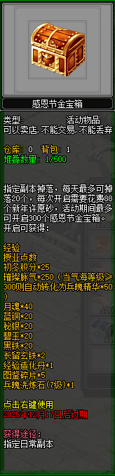 大侠通关副本、幻境等玩法会额外掉落感恩节银宝箱/金宝箱,每种宝箱每日最多获得20个,开启可得对应好礼。