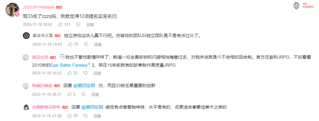 有玩家说盼着是个游戏大年,结果还是“山中无老虎,猴子称大王”,没有传统3A,就只能“矮子里拔高”。海外玩家将《光与影:33号远征队》拿到了12个奖项提名调侃为“Sweep”(横扫),认为哪里都有它就显得有些不合理了,国内不少玩家对此事也有异议,不理解为什么TGA将《光与影:33号远征队》也归入独立游戏范畴,若是如此,那年度最佳的提名为什么会有三款独立游戏;此外还有部分人贬损《咚奇刚:蕉力全开》就是任天堂家的《宇宙机器人》。
