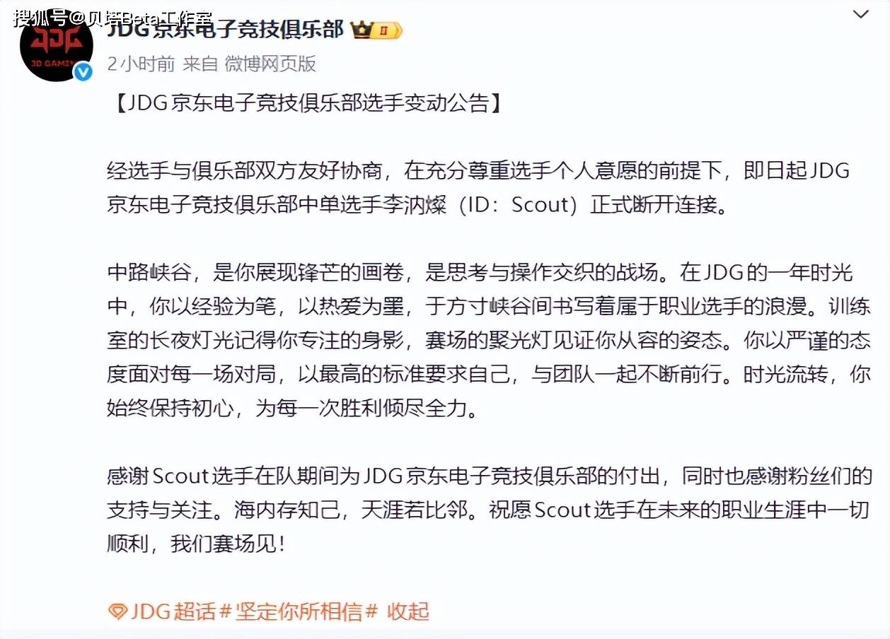 JDG官宣原文如下,表示:经过和选手友好协商,中单选手Scout正式断开连接。之后JDG称赞了Scout的操作和经验,认可他的比赛态度和对胜利的渴望,最后则是感谢他为JDG的付出,祝福他未来职业生涯顺利。