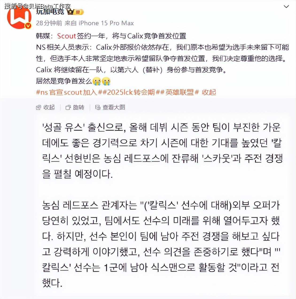 另外韩媒也第一时间爆料:scout和NS只签了1年,并且将和Calix竞争首发中单的位置。韩媒采访了NS的工作人员,工作人员表示Calix是替补的身份,不过还是有和Scout竞争首发的资格。