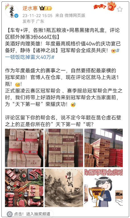 还有一次,《逆水寒》专门为“诸神之战”冠军队伍准备了人手一瓶定制五粮液+黑猪肉礼盒,整个庆功宴花费40万,当时在业内被传为奇谈。