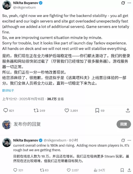 面对这场公关与技术双重危机,开发商Battlestate Games老板Nikita Buyanov已公开道歉,承认“发布过程确实很艰难”,并表示团队正在全力修复。