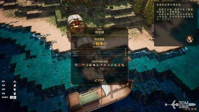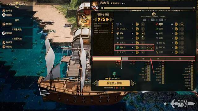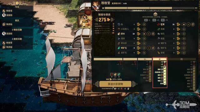 稍后会有物资船前来运送物资,每次接受物资都会欠下一笔债务,每隔几天都会有收债务的船只过来收债。玩家需要在这些天内采集岛上的资源用来交税。