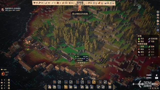 到后面我才想起来农田这一茬;打开农田界面,可以看到地图上的不同颜色,绿色越深就代表土壤越肥沃,选择最绿的地方规划农田区域;