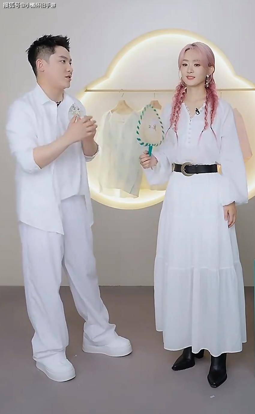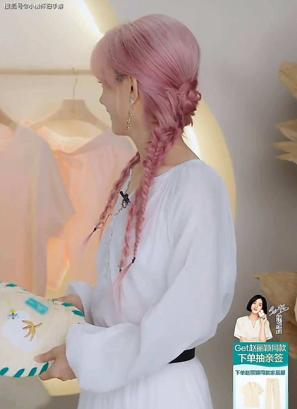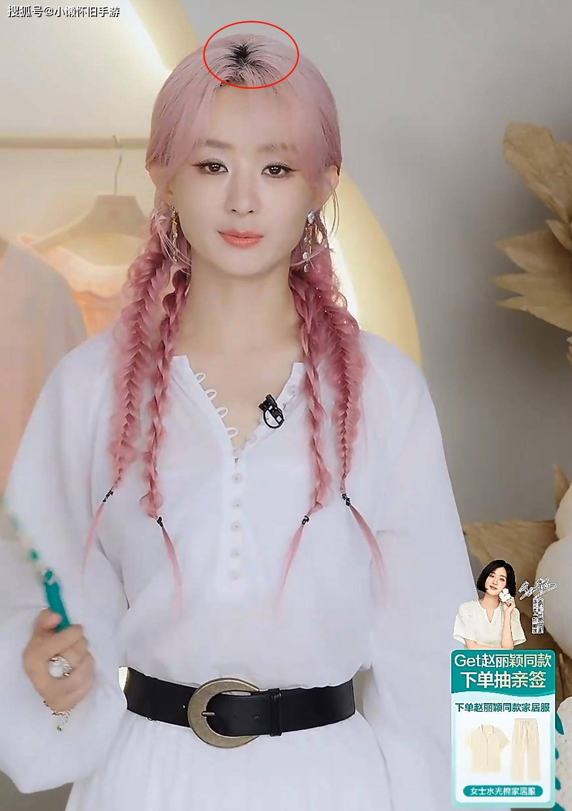 赵丽颖穿着白色裙子出现在直播间里,黑色的腰带突出了她的身材曲线,还戴了一个双马尾的假发,看起来像是麻花辫的样子。无论是发型还是服装、配饰,她都展现了一种甜美又带点酷的感觉。不过,赵丽颖本来就是黑发,假发的粉红色比她自己头发的粉红色要更深一些,所以颜色上的差异显得比较明显。