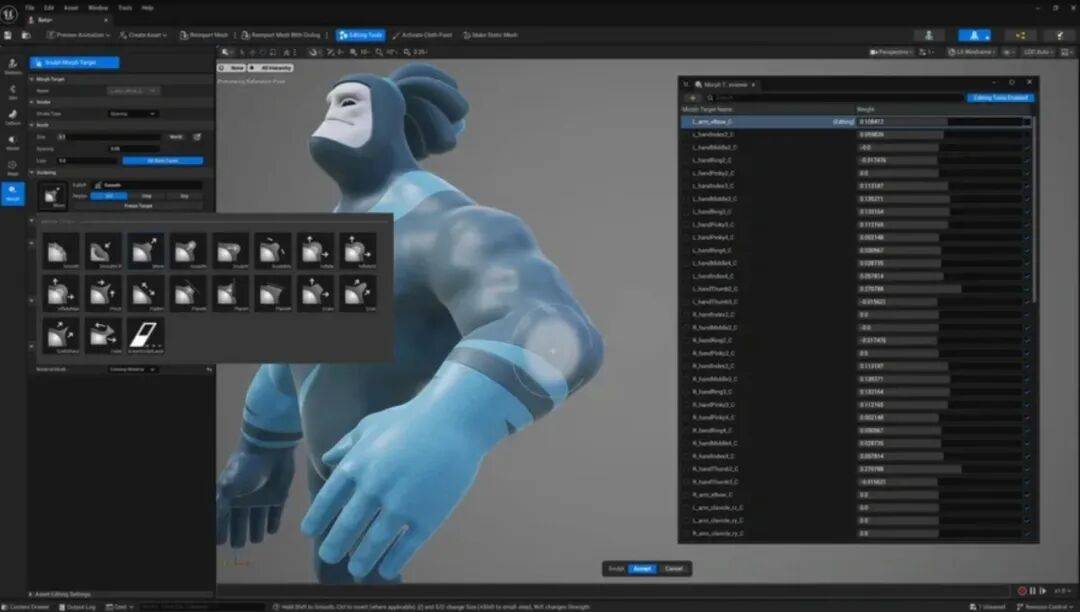 动画流程推进到绑定模型骨骼后,新版本的UE5还引入了新的骨骼编辑器功能。模型师可以在绑定动作后的中后期工作里,也能以雕刻工作流进行修改调整,避免了“改一发全身都要重做”的开发惨案。