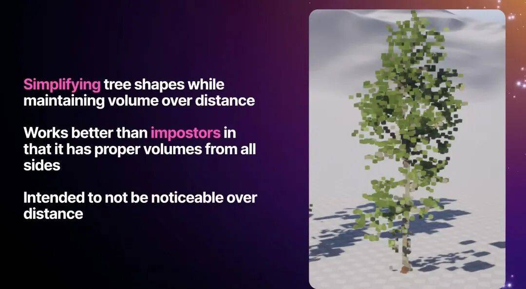 在植被渲染时,新版本的UE5引擎还引入了Nanite植被几何渲染系统。这套系统把过去用低面数模型替代远景模型的LOD技术,变成了相应的体素渲染技术。