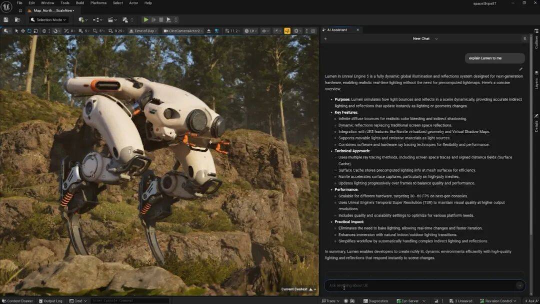 但和很多已经用上AI进行建模、编程的开发者不同,UE5.7里对AI的使用就要谨慎得多。它只是把AI做成了一个开发者助手,一位可以随时替你知道C++代码、解答UE引擎疑难杂症的AI开发者。