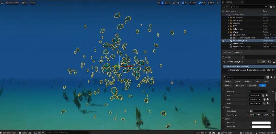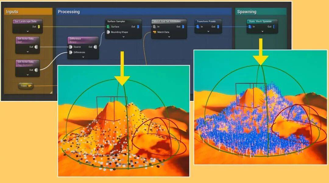 UE5.7里,程序化内容生成框架(PCG)已经能把素材快速填充到游戏中,无需任何代码,只要在可视化编辑器里按需调整好参数,就可以像撒豆子一样把树木、石头均匀、随机且合理地放置到场景中;