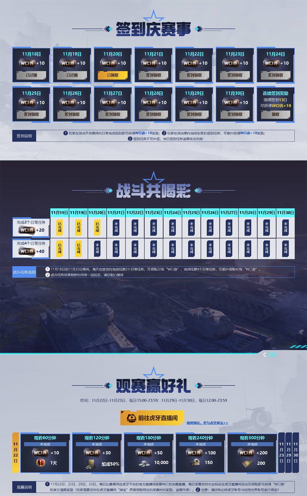 具体形式也很简单,只需每日在官网页面签到、完成每日任务即可。一天下来可以积攒多达70张WCI券,足够一抽了。等到明天比赛开打,车长们也可以蹲一波官方直播间,累计观看时长后也可以获得不少WCI券。