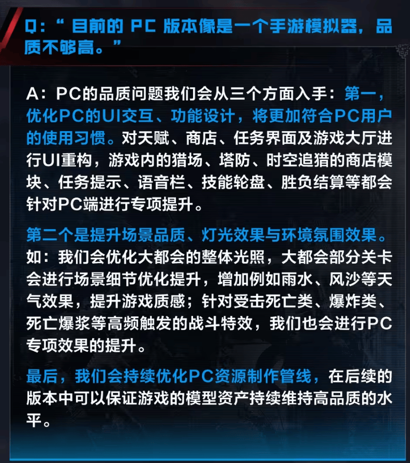 为此,我们很重视PC端的投入,这次测试有玩家反馈PC端的UI像模拟器,我们会在公测前实现原生PC界面,并对PC针对性做更好的效果表现。