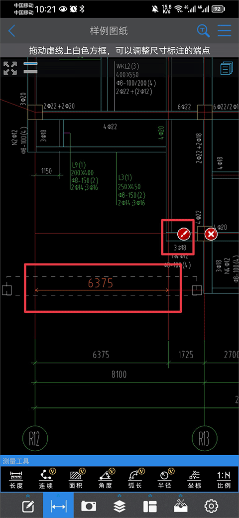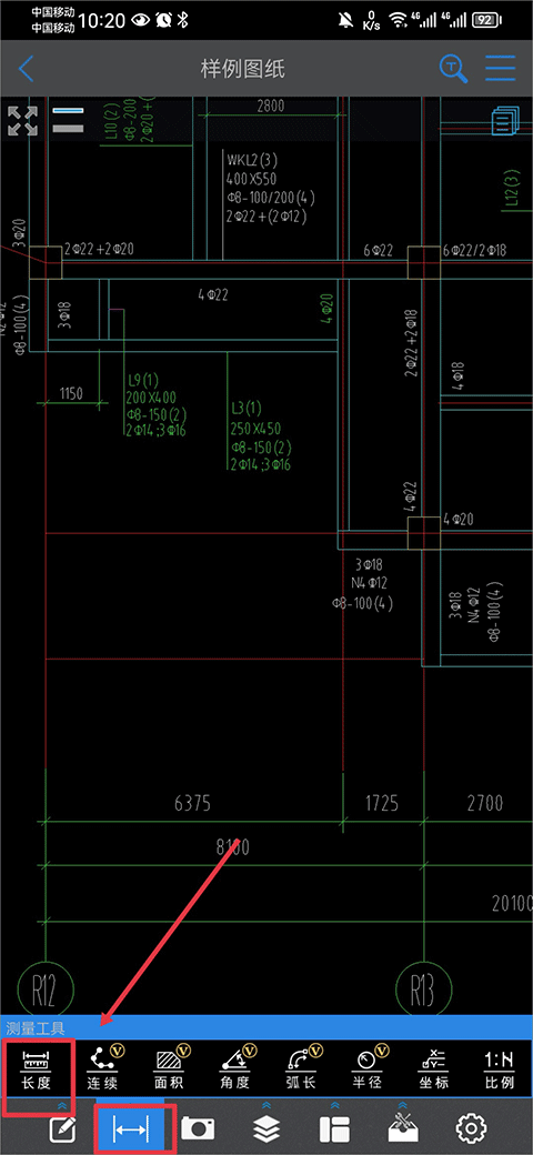 2、第二步:进入后将图纸放大,并在下方功能中的测量工具内点击长度。