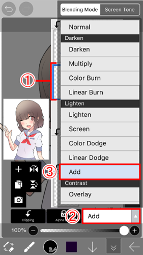 3、第三步:点击图层1使添加的图层成为当前图层。然后点击"添加"以打开步骤2的混合模式菜单。最后选择步骤3在 "混合" 菜单中添加。