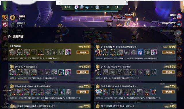 对局期间阵容工具会根据棋盘上的棋子,自动匹配出含该棋子的适配阵容,并且有相应的匹配度。阵容推荐会通过“右上角阵容栏、阵容一图流、更多阵容”三个方式,给铲铲玩家们提供目标棋子的所有阵容推荐和阵容运营思路。工具大师会给玩家推荐一套匹配度最高阵容,通过选择“更多推荐”即可出现不同匹配度的所有阵容搭配。
