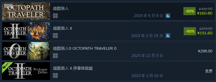 或许是受到SE旗下游戏近年销量不佳的影响,这次他是终于不嘴硬了,新作《八方旅人0》国区定价直降一百块来到了298,虽然仍不算便宜,但比初代的402和二代的379都降了一个档位。