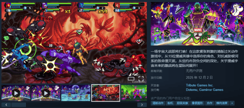 《漫威宇宙入侵》一款玩法超级复古的横版动作街机游戏,游戏中玩家可以操控诸多漫威超级英雄以敌人战斗,战斗玩法采用传统街机模式,体验十分复古,比较适合喜欢这种老游戏的玩家来玩。