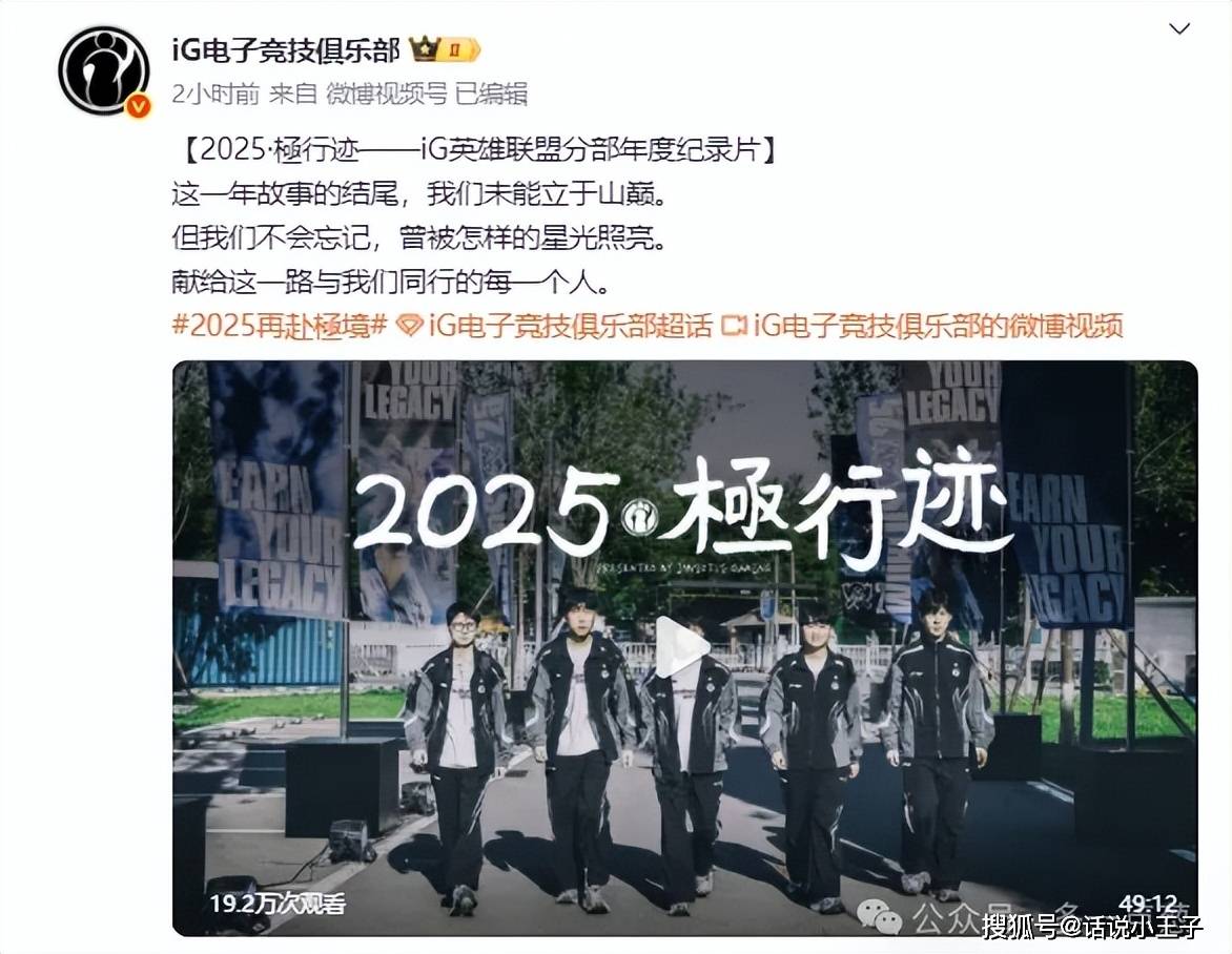都知道在这个转会期IG的热度很高,关于IG的很多小道消息传的沸沸扬扬。主要还是IG的管理层在整个转会期没有什么作为,这才导致IG现在濒临破碎,哪怕有钱,可能也买不到好的选手。对于很多粉丝来说,还是想在明年看到今年的全神班,毕竟今年的全神班可是给了大家很多美好的回忆,虽然在世界赛中止步17强,但是他们也并不丢脸,因为输的是最后的冠军队伍T1。现在关于IG转会期的消息倒是没有,只不过IG官方倒是放出了25年一整年的纪录片。