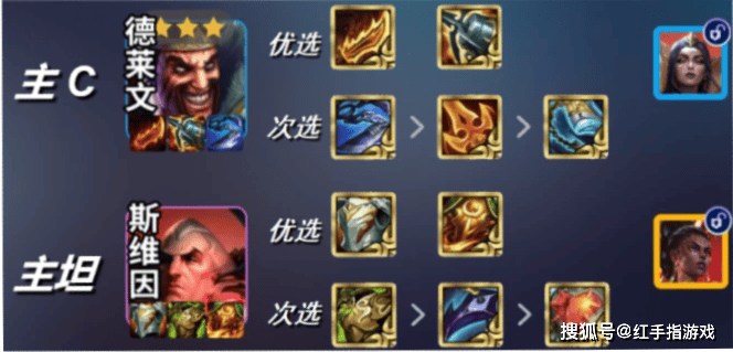 3.主C/主坦装备搭配:主C德莱文优先选择无尽、饮血,次选正义、破甲;主坦斯维因优选狂徒、龙牙,其次是反甲、石像鬼