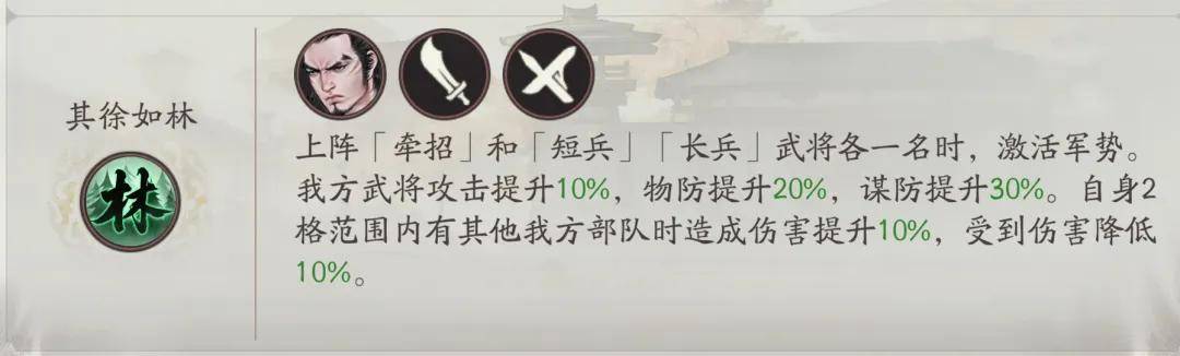 首先我们还是来说一下牵招的这个自带军势(阵型),“其徐如林”也是反映了牵招的特点,而这个军势客观来讲只论效果,也应该算是当前版本非常优秀的一个军势了,因为只要大家上的武将包含3个长兵、短兵,基本上也跑不太快,抱团前行应该就是常规操作了......所以触发其增减伤的效果也不难,不过......这个军势最大的问题也在于此,需要3个长兵、短兵(包含牵招)的上阵,或许大家目前一是不容易凑出这个组合来,二则是可能在兵营方面也没投入太多资源于长兵、短兵的升级,所以虽然牵招的军势看起来还不错,但当前版本的不足也相当明显。