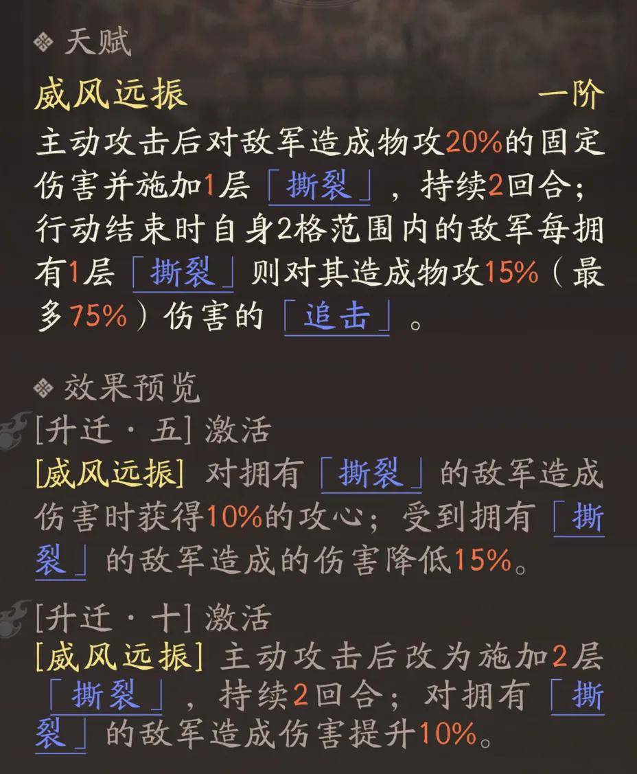 此外5阶后可以新增小幅吸血和减伤的特点,10阶后则可以新增施加“撕裂”的效率,同时提升牵招的伤害,那么这个牵招的天赋效果主要都是和“撕裂”状态挂钩,而且敌人的“撕裂”层数越高,则牵招的追击伤害也就越高,这也是为什么我们在把牵招当成主力来用的时候,还是需要搭配一些能额外施加“撕裂”状态的友方,例如张辽、乐进和陈到等都是不错的选择。