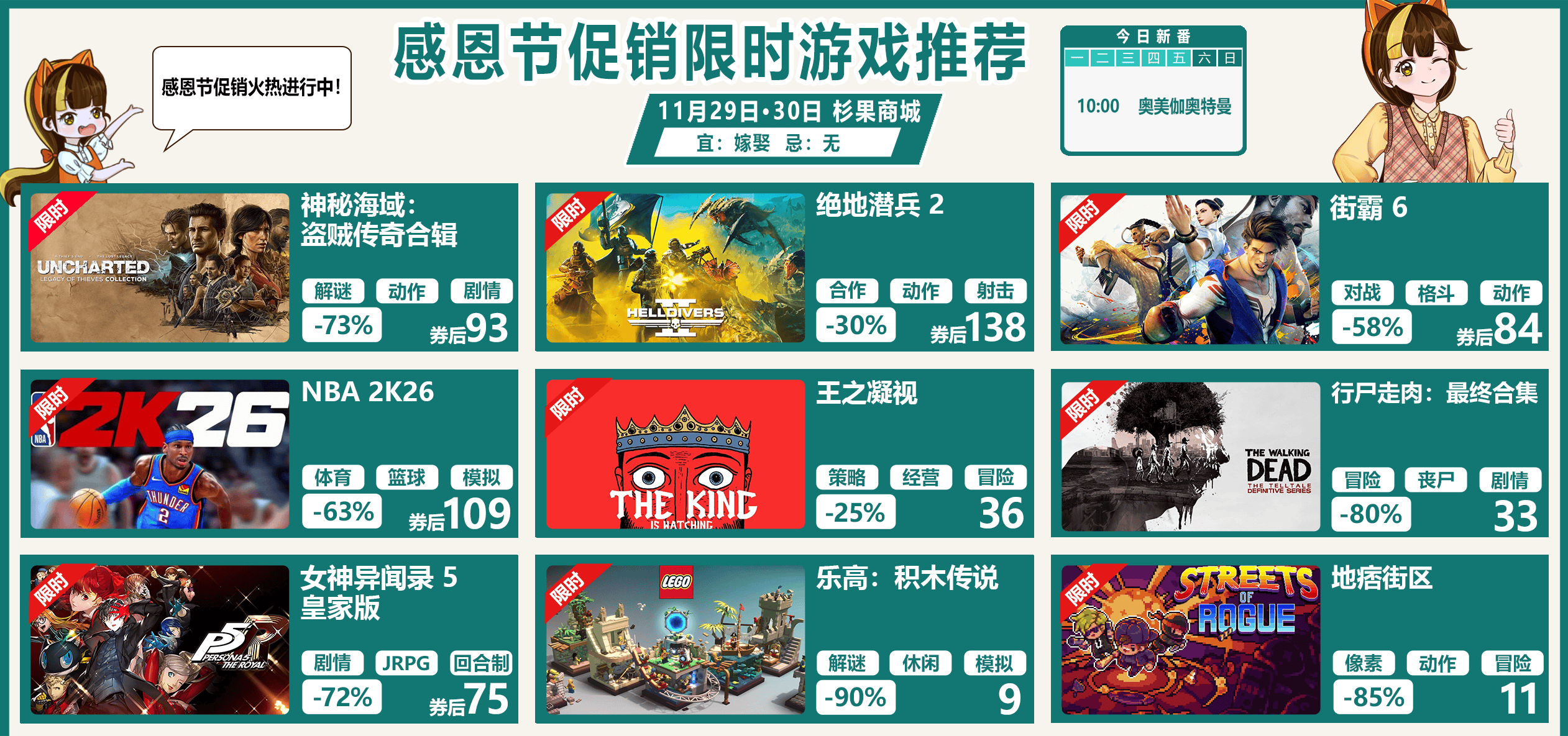 杉果感恩节特惠中,刚刚发售的热门新游或者预售大作,领券下单也能立享折扣!