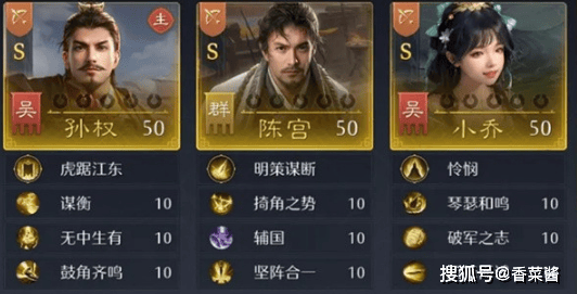 备注:孙权主将流,兵种选择弓兵。通过小乔和陈宫双辅助来达到快速恢复怒气效果,加快主将技能循环,主要输出全靠孙权主将技能,属于野战队伍不进入集结。