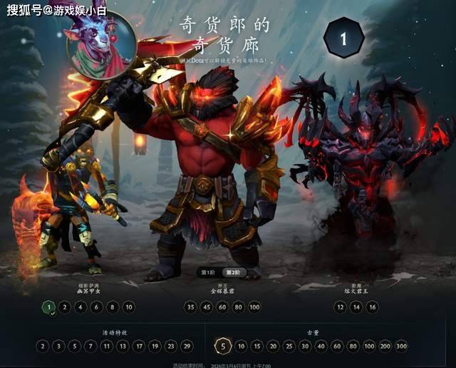 本期奇货郎奇货廊活动为玩家准备了多套英雄套装。分别是暗影萨满的“幽冥甲虫”套装,一共包含6个部件;是影魔的“熔火君王”套装,有3个部件;斧王的英雄套装分为烈烬执行者和金辉暴君两套,每套都有5个部件。玩家的奇货郎等级在达到指定等级时即可解锁对应奖励。