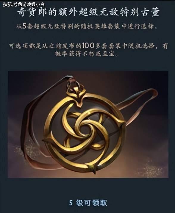 开启奇货郎的古董,玩家有机会随机得到100多套往年推出的英雄套装中的一套,也有较小概率能获得一件不朽饰品或者至宝饰品。其中,5级的奖励是“奇货郎的额外超级无敌特别古董”,玩家可以从5套超级无敌特别的随机英雄套装里进行选择,这些可选项都是从之前发布的100多套套装中随机挑选的,还有一定概率能获得不朽或至宝。